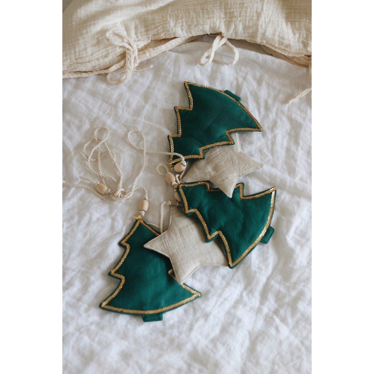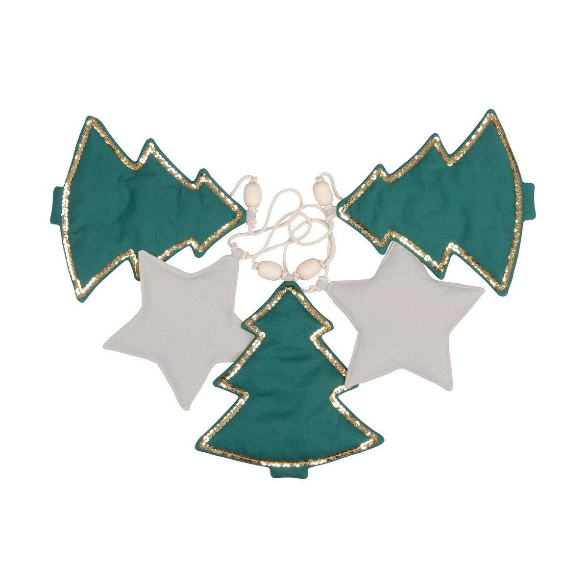 De kerstboom is het enige waar we bijna het hele jaar op wachten! De Moi Mili slinger is een leuke kleine decoratie voor de kinderkamer die een sprookjesachtige sfeer in de kamer creëert en aanzet tot spelen. Met kleurrijke, mooi aanvoelende hangers maken we slingers in verschillende vormencombinaties: schelpen, bladeren, sterren en kerstbomen. De decoratieve slingers zijn vooral een onmisbare aanvulling op je hemelbed, tipi, wiegje, ladeknop, muurhaak etc. Een kleurrijke hanger, hangend aan een katoenen touwtje of vastgebonden aan een item, ziet er gewoon prachtig uit! ONDERDEEL VAN DE CHRISTMAS TIME COLLECTIE Voel de sfeer van onze unieke collectie, geïnspireerd op de geurige kerstboom in een gezellige kinderkamer vol decoraties, snoepjes en cadeautjes. Combineer onze slingers met baldakijnen en kussens! De slinger is zorgvuldig gemaakt van vijf items, drie groene katoenen kerstbomen en twee linnen zandkleurige sterren, opgehangen aan een katoenen koord. Vijf hangers versierd met houten kralen, afgezet met een band met gouden pailletten. Afmetingen kerstboomhanger: 20 cm x 19 cm. Afmetingen sterhanger: 15 cm x 15 cm. Lengte slinger: 2 m.