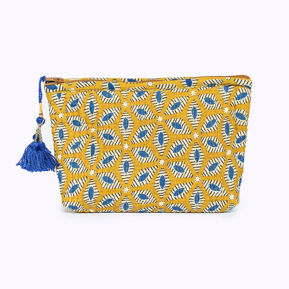 handgemaakte mini tas "Poppy Tiger" voor iedere dag! Details: (LxHxD): ca. 19 - 20 cm x 14 cm x 3,5 - 4 cm Bovenmateriaal van puur katoen met kantha-borduurwerk en (blokprint) houten stempelprint met natuurlijke / azo-vrije kleurstoffen Hoofdvak sluit met een ritssluiting Handgemaakte kwastjes - Decoratie Liefdevol handgemaakt en unieke details! Het speelse en handgemaakte mini tasje "Desert Flower" is een prachtige aanvulling op de make-up tas EN de shopper. Zij maakt de set perfect! Omdat hij perfect in je handtas past, is hij perfect voor lippenstift en handcrème, maar ook voor je geld of ID-kaarten (je past hier ook gemakkelijk je paspoort in!). Je kunt hem ook uitstekend gebruiken als portemonnee, klein make-uptasje of reisgenoot. Je verbeelding kent geen grenzen! Hier kunt u alle belangrijke kleine dingen in het leven georganiseerd en binnen handbereik houden. Het beste: elke tas is uniek en met liefde gemaakt in India. De medewerkers bedrukken de pure katoenen stof met de hand met behulp van houten stempels. Dit proces wordt blokprinten genoemd. Borduur de tas vervolgens met het bekende en traditionele Kantha-borduurwerk en maak de tas af met de kwastjesdetails aan de rits. Eerlijk, hulpbronnenbesparend en met een creatieve geest. Het buitenmateriaal is gemaakt van puur katoen en de binnenvoering is van bedrukt katoen. Een kleine productiefaciliteit in Jaipur, India produceert de geborduurde make-uptassen en eerlijke arbeidsomstandigheden. Bij de productie wordt het werken met grote machines vermeden, waardoor grote hoeveelheden water en elektriciteit worden bespaard. Het hulpbronnenbesparende proces weerspiegelt de ontspannen werksfeer. Wij hechten veel waarde aan bijzondere individuele stukken die met liefde en creatieve geest zijn gemaakt en nog steeds worden gemaakt - ook met onze en uw steun. Veganistische tassen Bij het productieproces worden geen dierlijke producten gebruikt en de katoenen stoffen worden met de hand bedrukt met een houten stempel. Doordat de medewerkers het Kantha-borduurwerk van katoenen draden met een naaimachine aanbrengen en het polyester binnengedeelte met een naaimachine innaaien, ontstaat er een puur veganistisch product. Hulpbronnen besparen De productiefaciliteit vertrouwt vooral op het uniek mooie blokdrukproces, dat een traditie kent in Jaipur. De medewerkers drukken de motieven en patronen met de hand op de katoenen stoffen met behulp van grote houten stempels en natuurlijke, azovrije kleurstoffen. Bij de productie wordt alleen op kleine schaal gebruik gemaakt van machines, zoals strijkijzers en naaimachines, waardoor het kleine bedrijf veel water en elektriciteit bespaart ten opzichte van andere grote productiefaciliteiten. Omdat de minitasjes allemaal handgemaakt zijn, verschillen ze allemaal van elkaar in de plaatsing van het patroon.