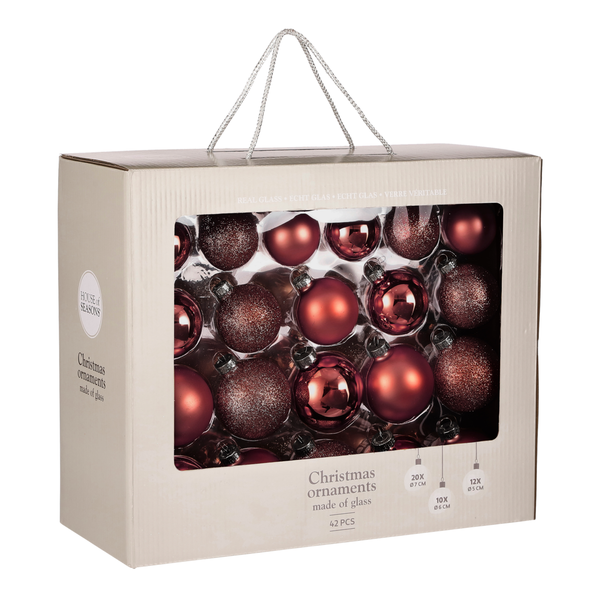 Met deze House of Seasons kerstballen wordt het decoreren van je kerstboom nog leuker! De set bestaat uit maar liefst 42 stuks, dus je hebt gelijk een mooie basis. De kerstballen zijn gemaakt van glas en hebben een donkerrode kleur. Ideaal voor een warme en toch feestelijke uitstraling! Er is een glimmende en een glitter variant in verschillende afmetingen. Zo zijn er 20 kerstballen van Ø7 cm, 12 van Ø5 cm en 10 van Ø6 cm. Leuk om te combineren met andere kerstboom decoratie uit de House of Seasons collectie!