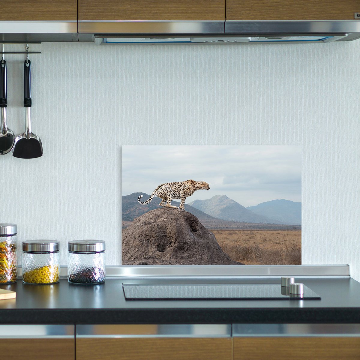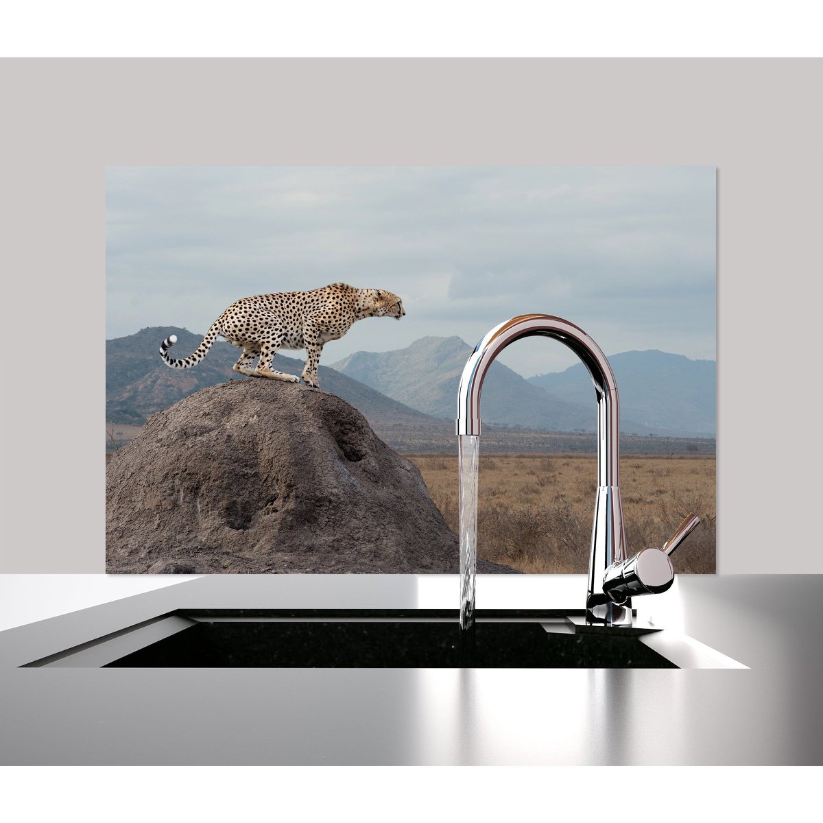 SPATBESCHERMING MET DESIGN! Onze bedrukte spatscherm van hoogwaardige aluminium DiBond-plaat is niet alleen functioneel, maar ook een echte blikvanger in uw keuken. Het motief van een majestueuze cheetah op een rots geeft een exotisch tintje aan je kamer. De UV-stabiele beschermlaag zorgt ervoor dat de afbeelding ook na langdurig gebruik niet vervaagt. Dankzij de meegeleverde zelfklevende pads en zuignappen is montage op diverse ondergronden kinderspel. Bescherm uw muren tegen spatten en voeg een vleugje wild toe aan uw keuken met onze achterwand. Productinformatie: Materiaal: Alu-DiBond Leveringsomvang: Plakpads en 4 zuignappen voor zelfmontage Queence spatscherm - het origineel made in Germany!