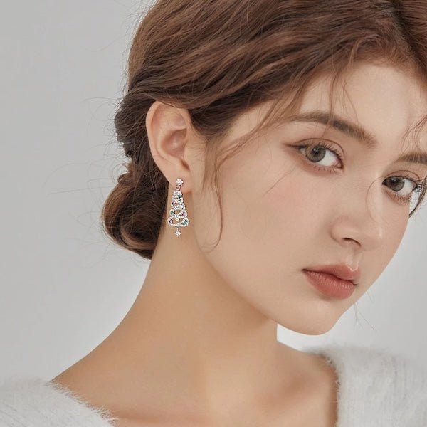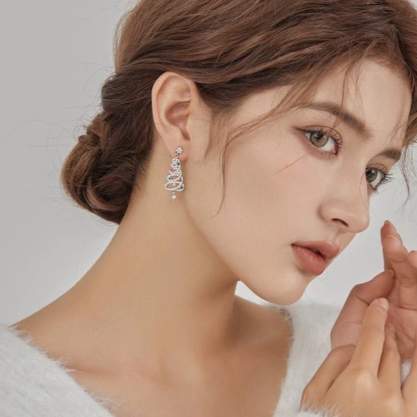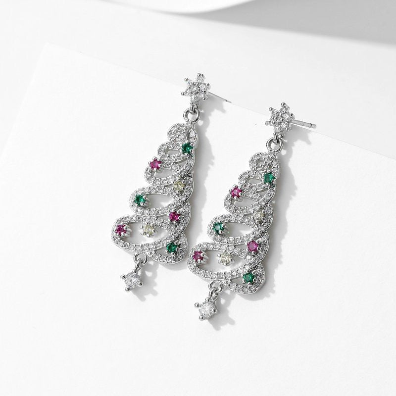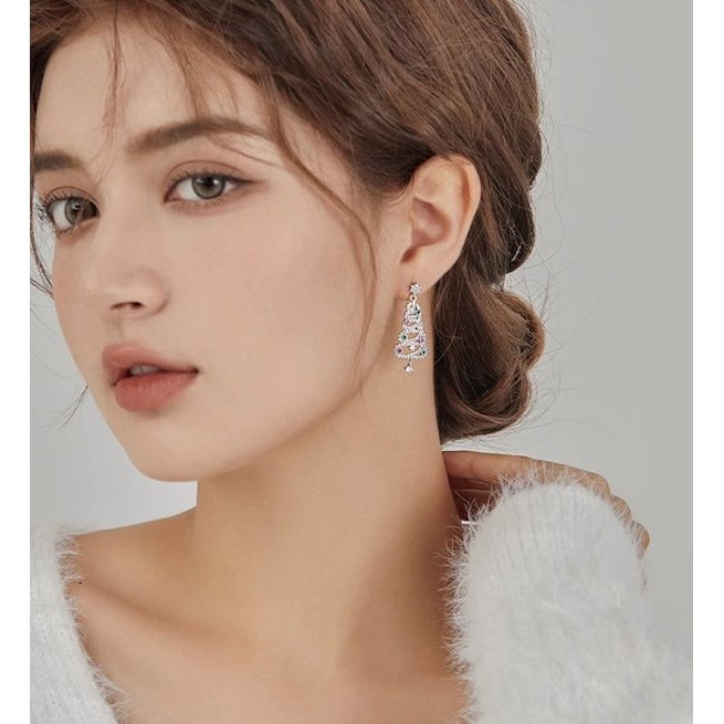Bovenaan de oorbel voegt een sneeuwvloksteen een vleugje winterse charme toe, terwijl het kerstboomontwerp wordt geaccentueerd met levendige groene en roze stenen, wat het sieraad een feestelijke flair geeft. Het hoofdframe, samengesteld uit messing en versierd met een verzilverde afwerking, vormt de perfecte achtergrond voor de fonkelende edelstenen. De hele body van de oorbel is minutieus ingelegd met transparante zirkonia, waardoor een oogverblindend schouwspel ontstaat dat verfijning uitstraalt. De afmetingen van deze oorbellen, 3,7 x 1,4 cm, bieden een balans tussen elegantie en statement, waardoor ze ideaal zijn voor een feestlook die superglanzende allure belooft.